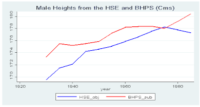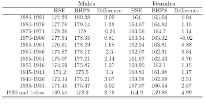 The purpose of this post is to alert researchers towards biases that arise when people self-report their height. I will contrast the way height is reported between two different surveys, the Health Survey for England and The British Household Panel Survey. The 2005 Health Survey for England reports heights objectively – as measured by a visiting nurse using specifically designed apparatus. Wave 14 of the British Household Panel Survey asks participants their heights subjectively. Both surveys specifically want measured height from participants not wearing shoes. In addition, both surveys are nationally representative when compared to the UK census. For the purposes I only look at adults aged over twenty born in England of white race or “British,” ethnicity. Results are split by gender and into year of birth cohorts.