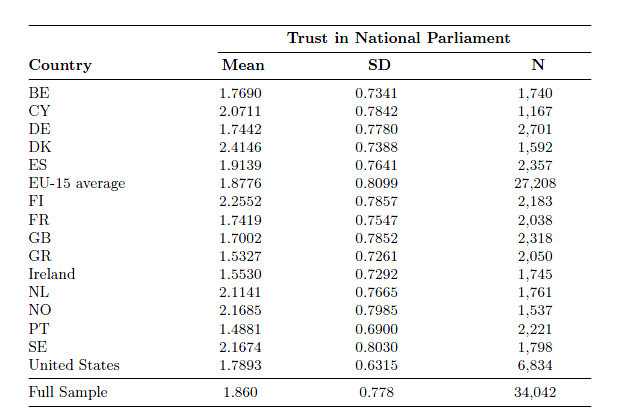 In 2008 American government expenditure over GDP was 0.37, markedly below the EU average of 0.47. With the Tea Party being the talk of the town on this side of the Atlantic, I wondered how much of this was attributable to Americans simply trusting Congress less. Does the old cliche of Americans really distrusting government hold true? Not really.